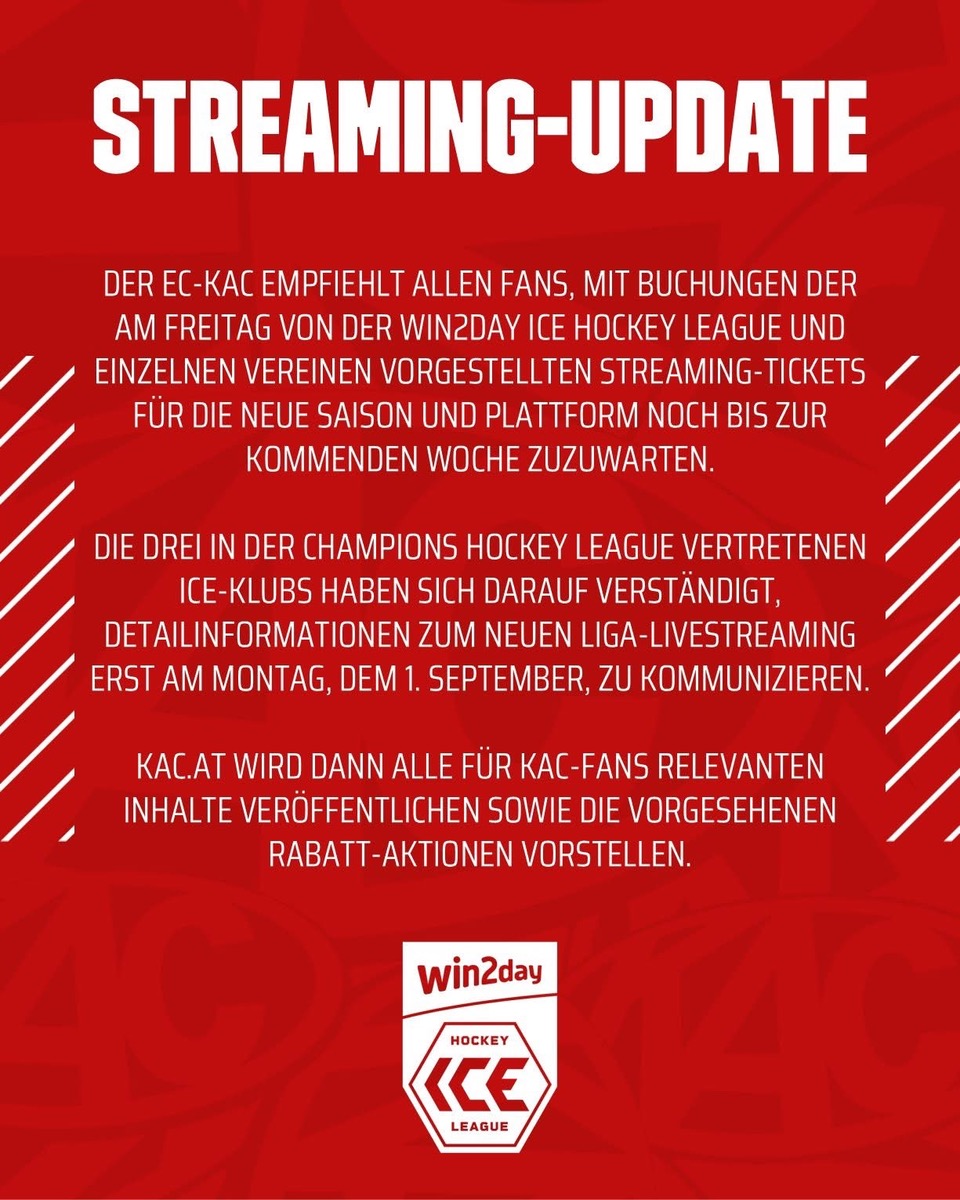 Gibt es beim KAC auch günstigere Streamingabos für Abonnenten? VSV wirbt damit, beim KAC wieder mal Funkstille. Vermutlich wird man bis 2 Stunden vorm ersten Auswärtsspiel warten. Hauptsache die x-te Europacup Story ist rechtzeitig online