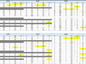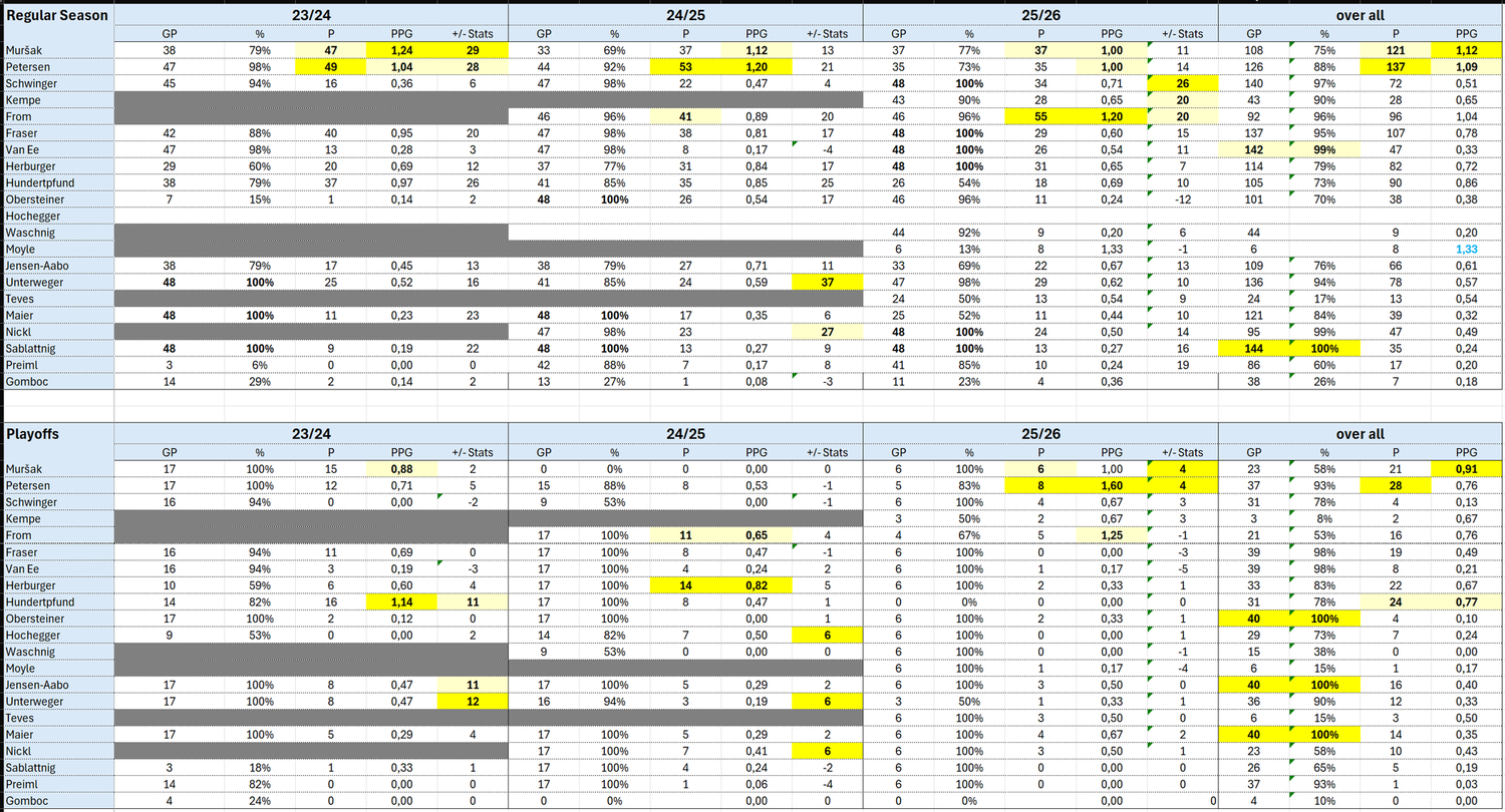 Eine Betrachtung der wesentlichen Stats über die letzten 3 Saisonen seit der Übernahme von F&F (nur auf den heurigen Kader bezogen und mit ein paar Lücken, v.a. was die U20-Spieler betrifft) getrennt nach Grunddurchgang und Playoffs: