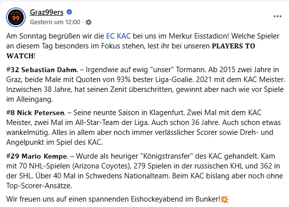 Wie sehen eigentlich die Grazer Fans auf Social Media die „Players to Watch“ Vorschau aufs KAC Spiel?