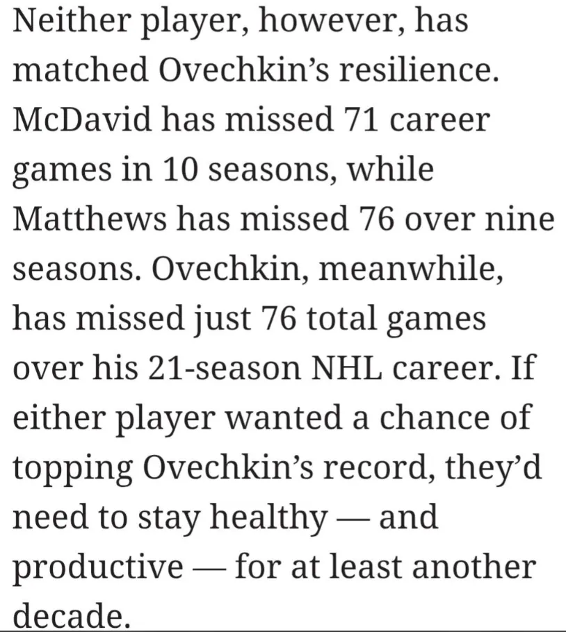 in deinem Foto wird McDavid und Matthews angesprochen und darauf beziehen sich die Verletzungen, ein Lemieux ohne Krankheit wäre auch ganz wo anders am Ende der All-time Tabelle gelandet, ein Crosby ohne Gehirnerschütterung zu seinen Anfängen, das ist in erster Linie Glück und nicht nur harte Arbeit