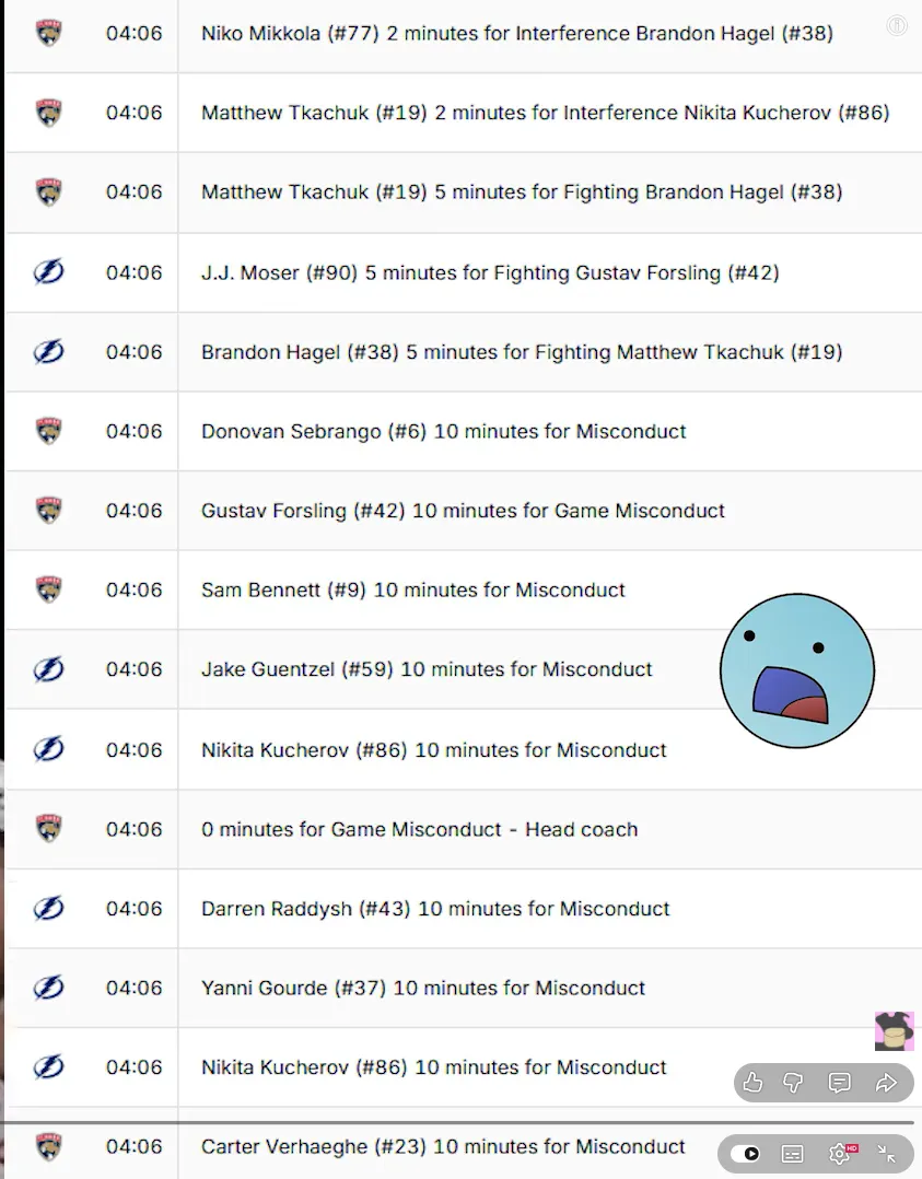 Florida ist einfach ein .rschlochtruppe. Wie erst Mikkola und dann Sekunden später der Tkachuk den nicht beteiligten Kucherov checken, hat mit Hockey nicht mehr viel zu tun.