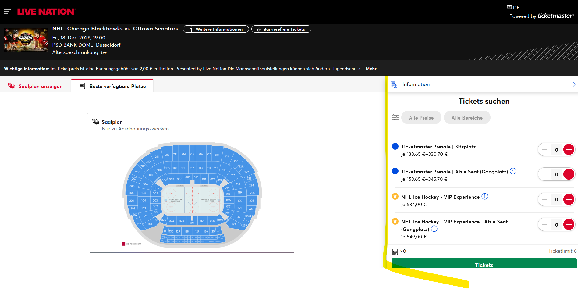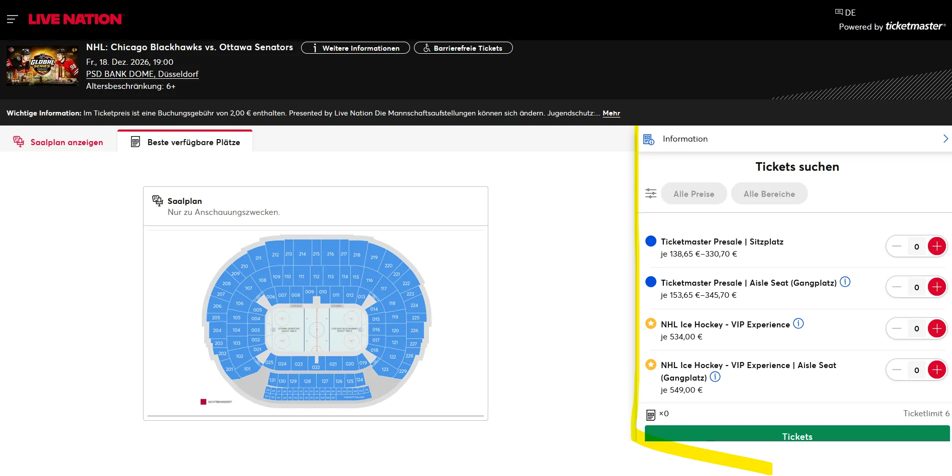 Tickets für die nächstjährigen Spiele in Düsseldorf sind wohl schon im Verkauf, nicht das ich hin will, aber das man den DEG Stehplatzfans mit Dauerkarte ein Vorkaufsrecht einräumt ist das eine, das andere, daß die bis zu 6 Tickets kaufen dürfen.