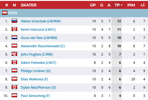 Die Offensive dürfte nun auch endlich bisschen heißgelaufen sein, wir sind das Team mit den zweitmeisten Toren hinter Laibach. Und das obwohl unsere erste Linie im 5 vs 5 eigentlich genau gar nicht funktioniert und unser Powerplay weiterhin mau ist - also umso positiver, dass es bereits trotzdem offensiv läuft.
