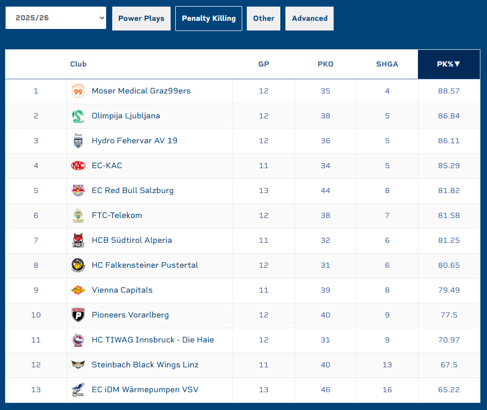 Auch der anderen Seite bleibt aber halt auch der Eindruck, dass es Baustellen gibt, die einfach zu wild sind um sie "simma halt net besser" zu vebuchen. #1 ist das das PK 66,67% ist inakzeptabel. Das PP mit 17,65% auch alles andere als gut, ein 2er sollt schon davor stehen. Sowas kostet uns allein schon regelm. Punkte, gerade in knappen Partien wie zuletzte ggn. Pustertal & Innsbruck. ggn. Pustertal das obligatorische UZ Goal gfressen und ggn. Innsbruck keines gemacht (waren zugegeben aber nur 2 Gelegenheiten). Unser letztes PP Tor haben wir ggn. die Ungarn vor 3 Runden geschossen - auch nur 1 genütztes PP von 5 an diesem Abend. Zu wenig.
