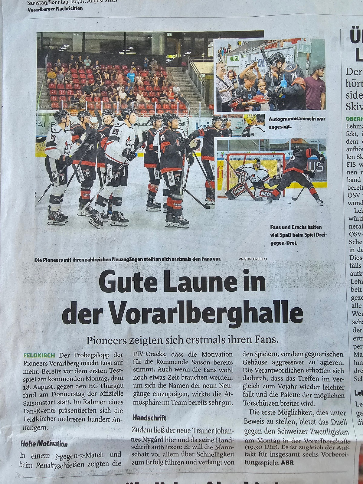 Feldkirch. “Es war ein guter Start”, lautete das Fazit von Pioneers-Coach Johannes Nygård zum Testauftakt gegen den HC Thurgau. Beim 2:1-Erfolg gegen das Swiss-League-Team gefiel dem Finnen vor allem die Leistung in der Angriffszone. “Wir haben hier mit und ohne Puck viel Druck aufbauen können. Wir konnten auch das Tempo in den ersten beiden Dritteln mitgehen.” Nicht so gut gefiel ihm jedoch die Verteidigungsarbeit. “Da ist sicher noch genug Luft nach oben. Aber dafür sind solche Vorbereitungspartien ja gedacht.”