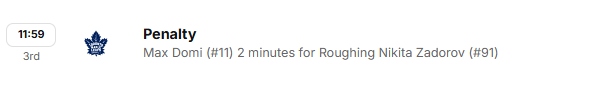 Domi's huhuhu du hast meinen C in die Kabine geschickt, jetzt hol ich dich aber (20min. später) hat am Ende des Tages eine dumme Strafe gezogen, bei dem Spielstand. Leafs in a nutshell. Jetzt wehren sie sich einmal und dann machns das wieder falsch :D