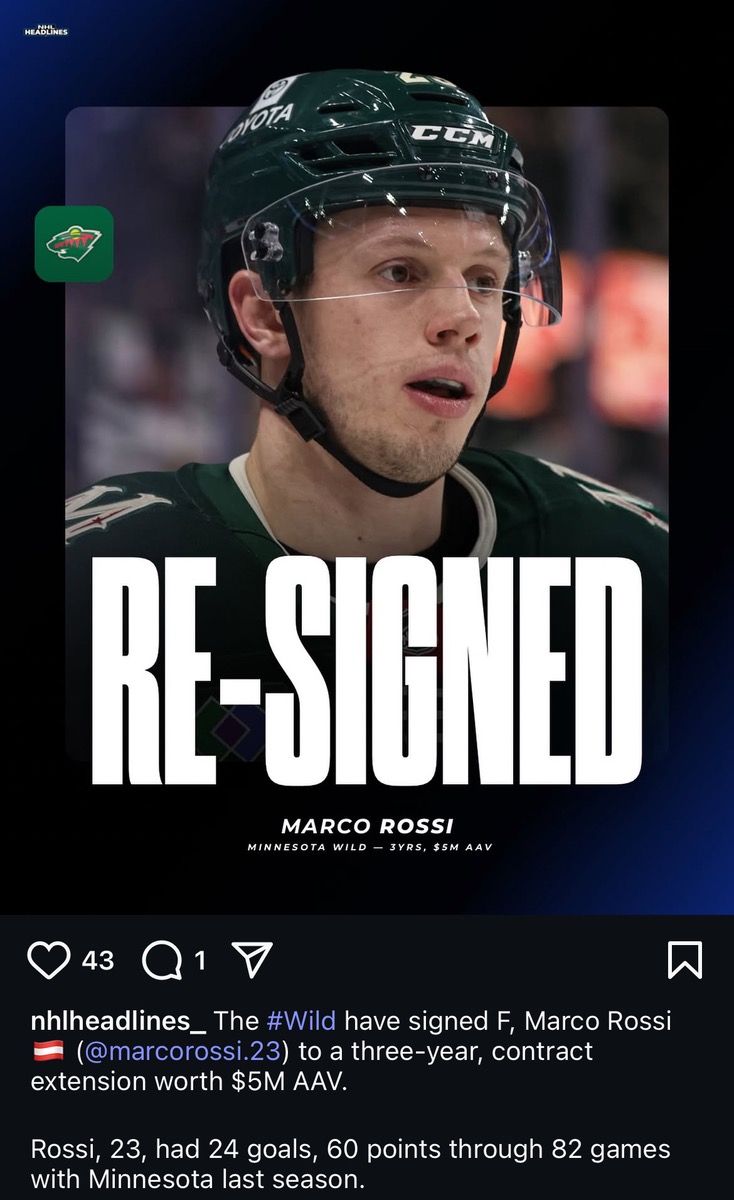 Ich glaube die Wild haben schon deutlich gemacht, dass sie Rossi nicht gerne abgeben möchten und einiges auf ihn setzen. Nur wollten sie eben aufgrund seines Status als RFA einen guten Deal herausholen. Das ist ihnen gelungen. Rossi muss halt in dieser Situation in den sauren Apfel beißen. Wenn er sich weiter so entwickelt wird er eben in 3 Jahren einen hochdotierten Vertrag bekommen, wo auch immer.