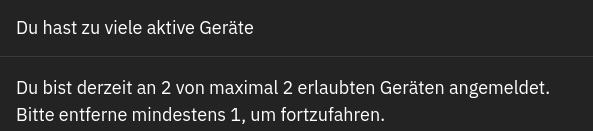 Blödsinn… sorry aber „2 von maximal 2 erlaubten Geräten, entferne eines um fortzufahren“ ist nicht deutsch…