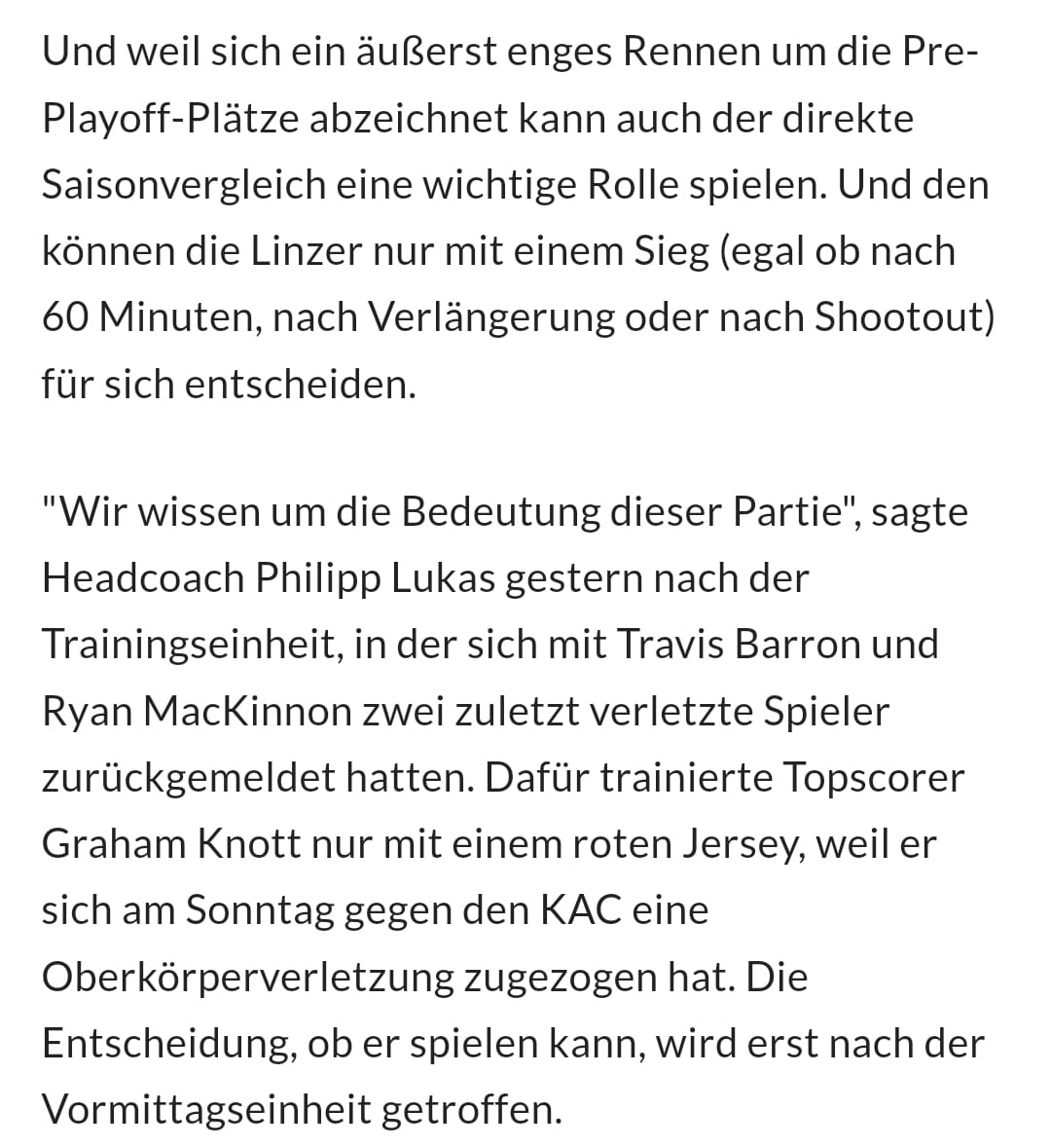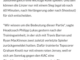 Knott übrigens fraglich für heute. Trainiert aktuell im Roten Trikot mit. Hat gegen den KAC eine leichte Oberkörperverletzung erlitten