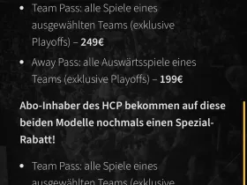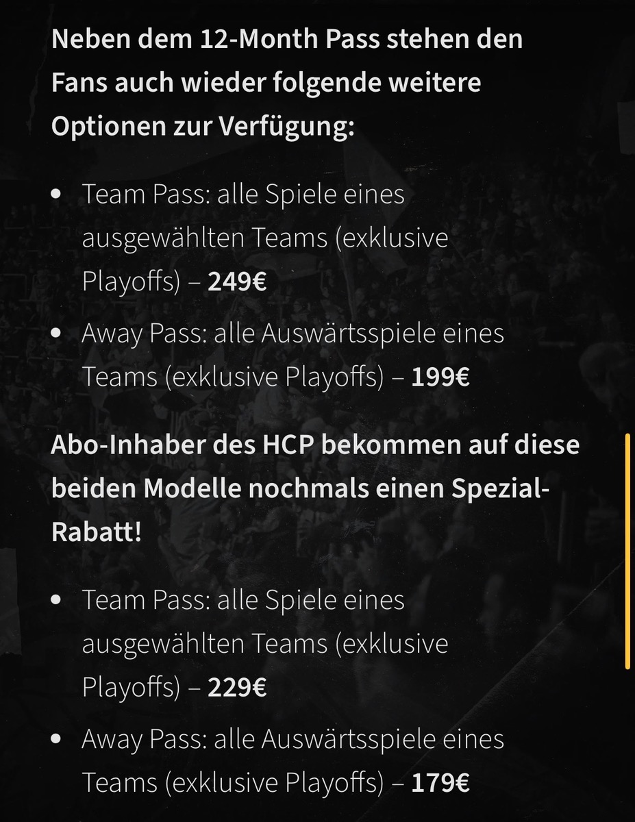 Auch wenn mein Team im 1/4 Finale ausscheidet, oder erst gar nicht in die Play-Offs kommt, wäre dies ein tolles Angebot. Ein Season-Pass ist für mein persönliches Preis-Leistungs-Verältnis nicht so sinnvoll.