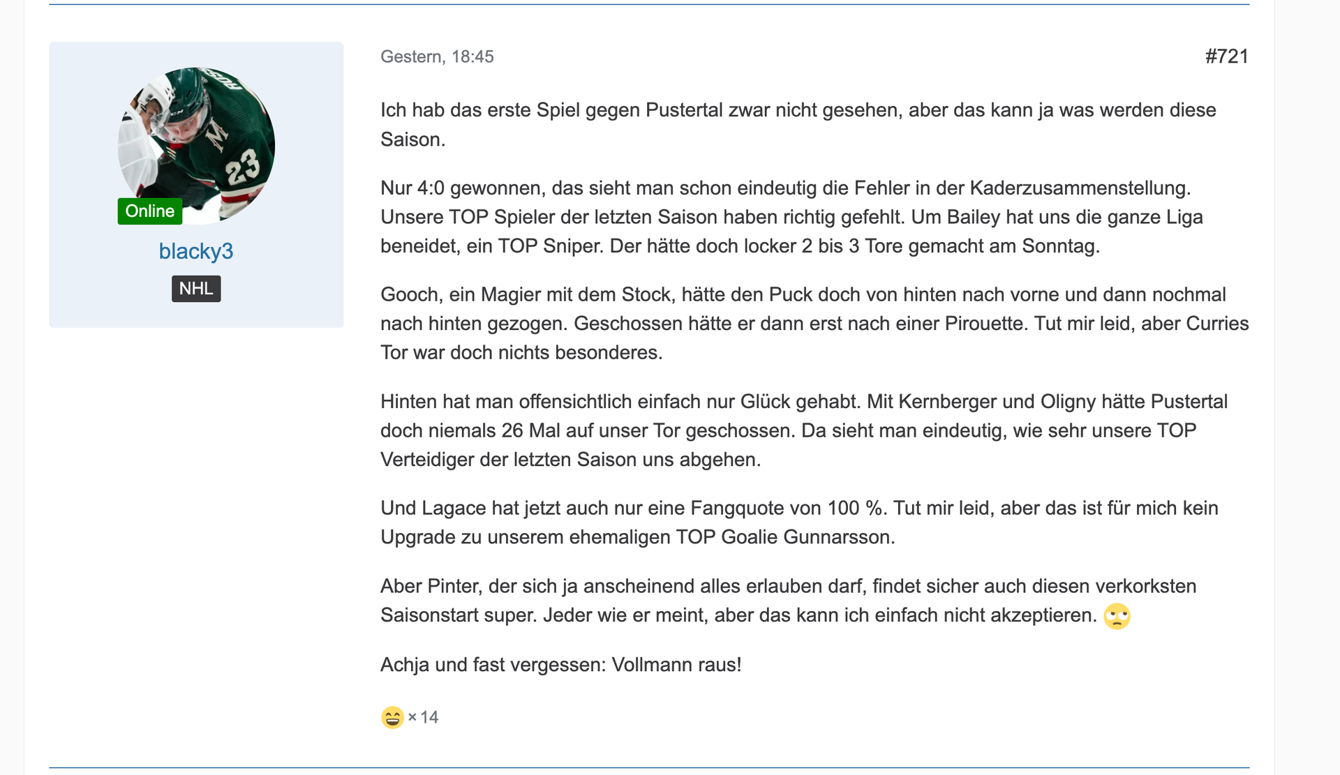 Pfoa das waren jetz 3 punkte mit denen ich nicht gerechnet hab. Hab jetz aber auch nur die letzten 12 minuten gesehen. PK dürfte wieder überschaubar gewesen sein. Find auch die letzten gepfiffenen strafen durchaus ok.
