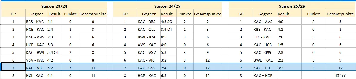 Ein Spiel mit null Aussagekraft, außer, Moment, der nächste Beweis das vieles nicht passt. 92 und 52 sehr auffällig, um 92 kann man sich jetzt schon bemühen lieber Alex! Hundertpfund mit der Präzision des gesamten KAC den Goalie angeschossen bzw dessen Stock. Das 2:1 muss man, „kann“ man aber derzeit nicht besser spielen. Ein danke dem Spielplan für den heutigen Gegner.