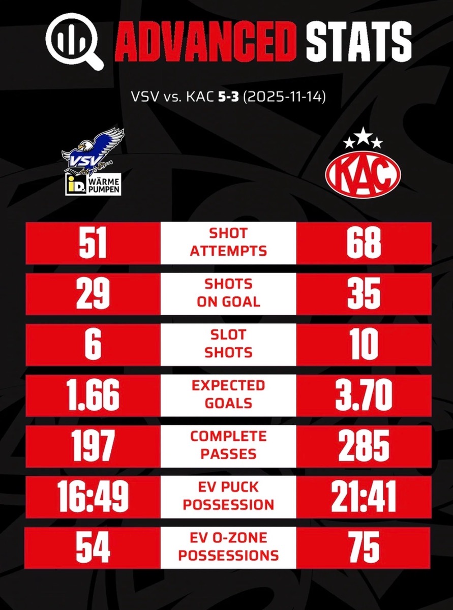 Klagenfurt mit viel Puckbesitz und wenig Output. Im Eishockey gewinnt eben Effizienz und nicht Puckbesitz.