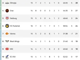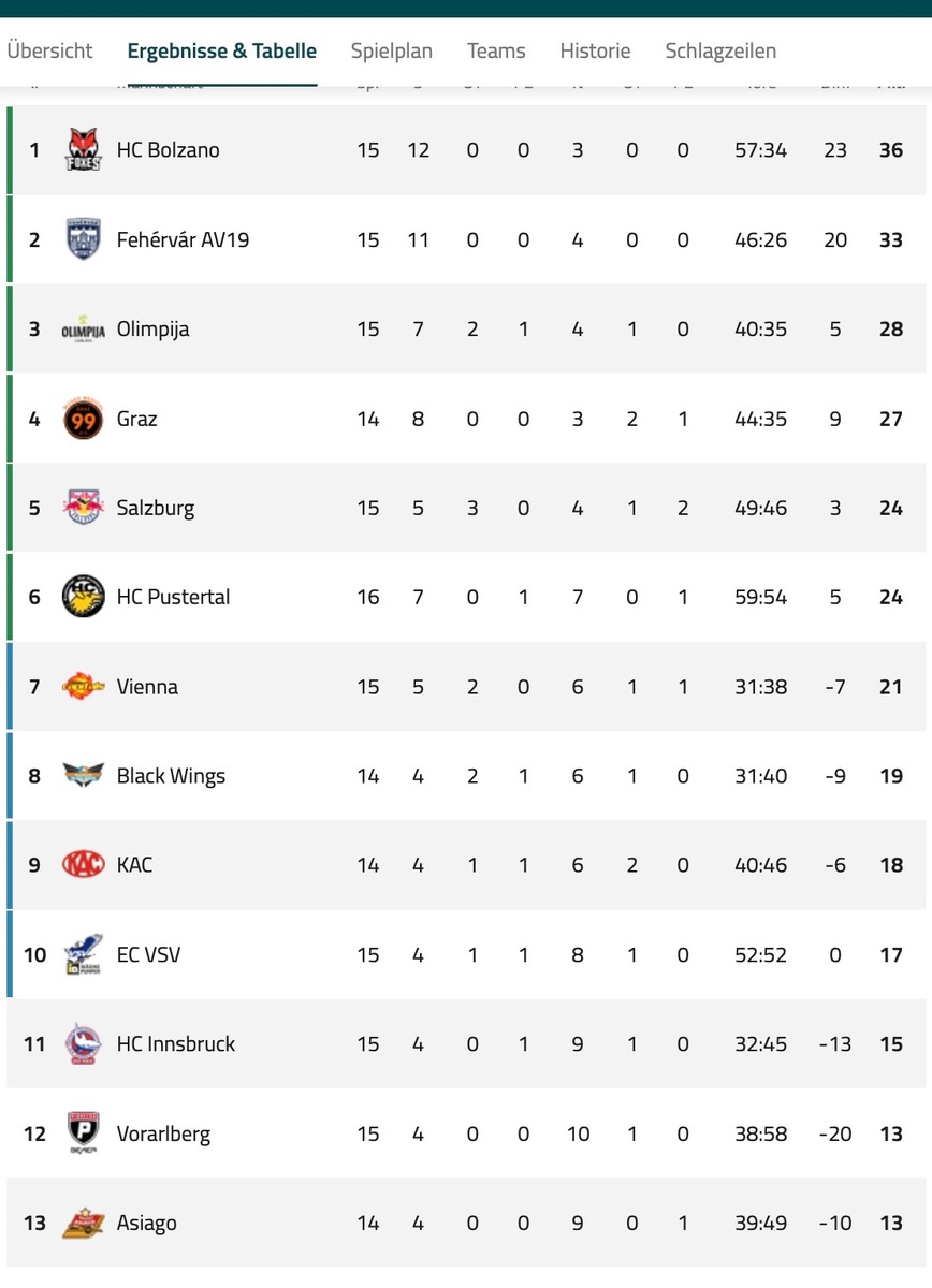 Aber Papier ist Geduldig. Wir sind nach 15 Runden an Graz/Klagenfurt/Salzburg/Bozen dabei. Selbst Laibach oder Pustertal dürfen sich keine Schwächephasen leisten. Zum jetzigen Stand würd ich keine Prognose abgeben, wer unten spielen muss. Weil da 9 Teams allesamt noch sehr viel Potential nach oben aber auch nach unten haben.