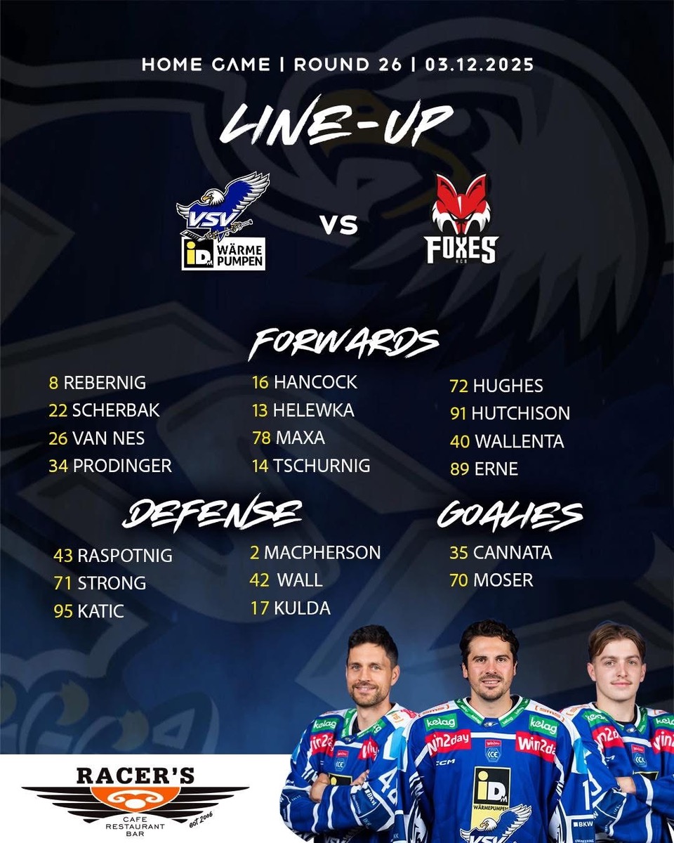 26. Runde EC VSV gegen HC Bozen 3.12.2025 19:15 Live auf ORF Sport +