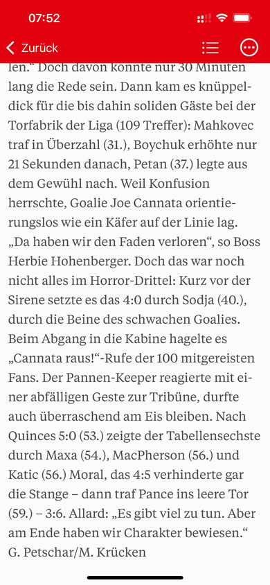Das Spiel heute war sicher nicht optimal, aber was sich der Fanclub Absolut geleistet hat war unter aller Würde. Nach dem zweiten Drittel wurde Joe Cannata auf übelste beschimpft und auch vor seiner Frau machte man nicht halt. Nach dem Spiel wurden wieder einige Spieler aufs übelste beleidigt und bedroht und es musste unser Captain Linder einschreiten damit nicht alles komplett eskaliert ist . Das sind keine wahren Fans . Man muss sich für diese Leute einfach nur schämen.
