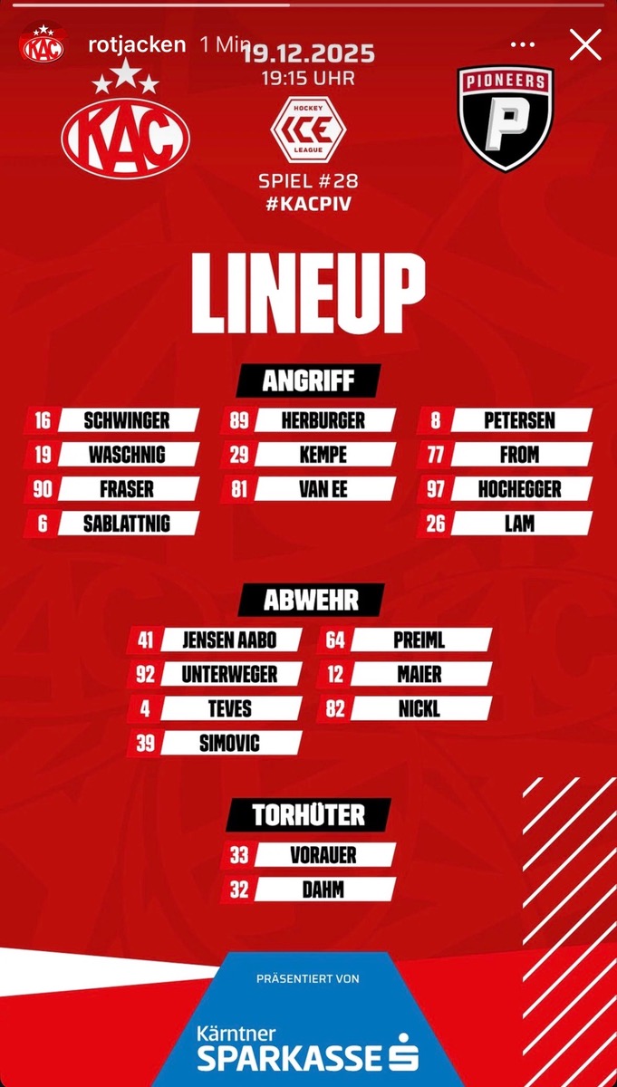 30.R: EC KAC - Pioneers Vorarlberg, Fr 19.12.2025 19:15 Uhr