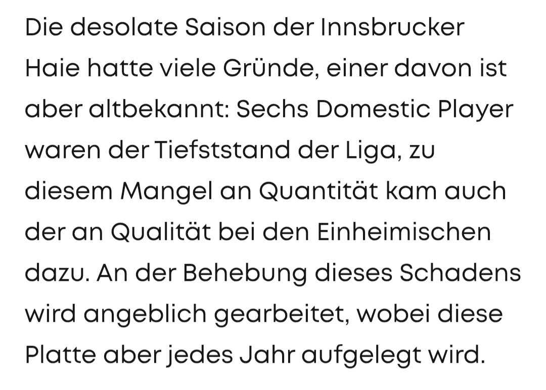 Ich bleibe bei meiner Meinung wie schon im letzten Jahr, man kann Imports holen, welche man will. So lange im Einheimischen Sektor nicht gravierend reagiert wird (wie in der TT angedeutet) wird sich nichts ändern. 5 TK im Angriff plus Witting, dann haben wir zwei Linien. Die dritte und vierte Linie wieder mit den gleichen Akteuren (Bär, Mader usw.). :(