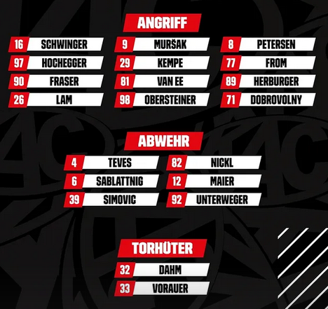 Hundertpfund Gomboc Waschnig Aabo Preiml fehlen und trotzdem ein nominell volles lineup.