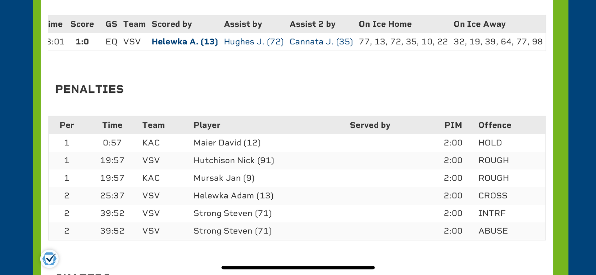 Höhepunkt war die nichtgegebene Strafe von an Roten gegen Hughes allein vorm Tor - klares Slashing!!!