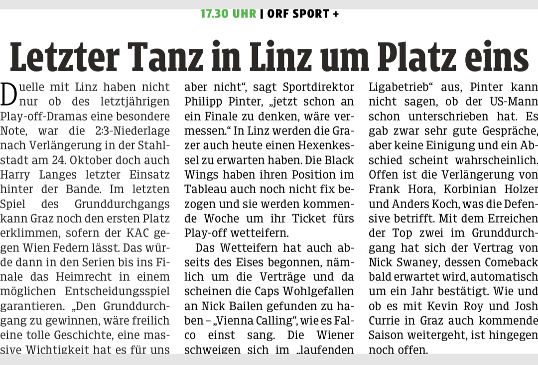 Laut morgiger Ausgabe der Kleinen Zeitung hat sich, mit dem Erreichen der Top zwei im Grunddurchgang, scheinbar der Vertrag von Nick Swaney automatisch um ein Jahr verlängert. :)