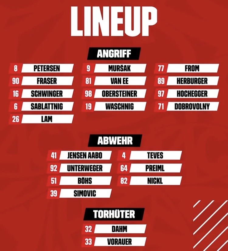 gegen Salzburg zwei Stammkräfte in das Lineup zurück: Jesper Jensen Aabo, der aufgrund einer Unterkörperverletzung elf Partien verpasst hat, steht ebenso wieder zur Verfügung wie Josh Teves, der wegen einer Oberkörperverletzung drei Mal zuschauen musste