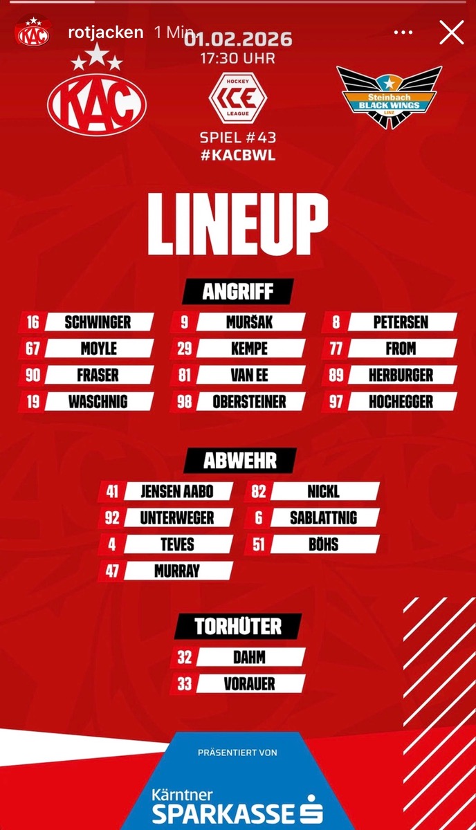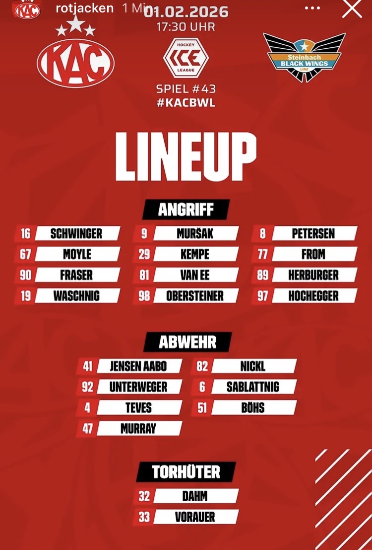 46. Runde EC KAC - EHC Black Wings Linz, Sonntag 01.02..2026, 17:30 Uhr