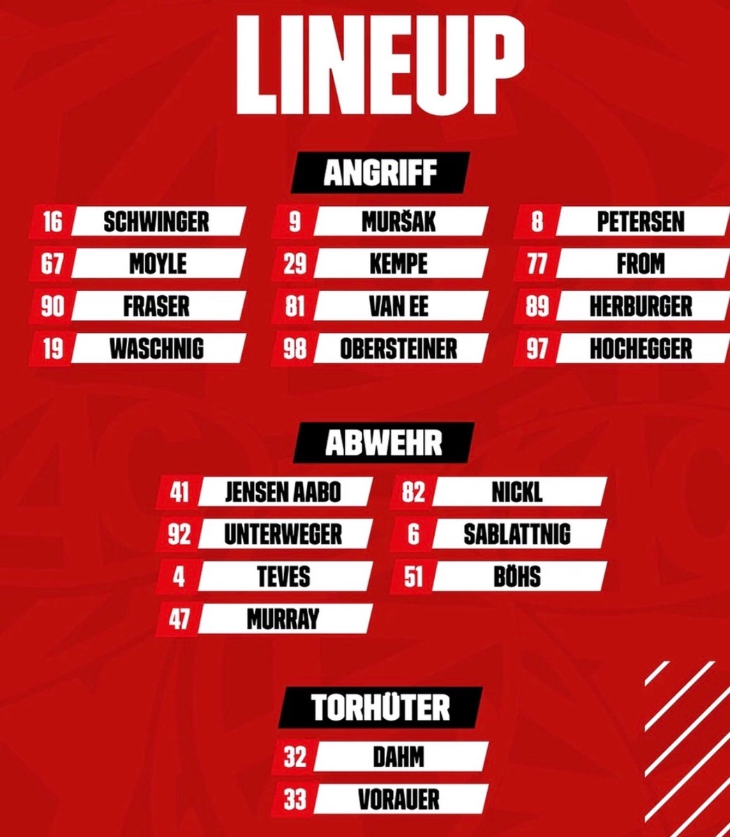 Hinten jetzt Jensen Aabo, Unterweger als die unangefochtenen Chefs, dann Murray, Nickl, Teves und Preiml. Das ist schon bombenstark, wobei ich auch nichts dagegen hätte, Teves durch Sablattnig zu ersetzen in den Top-6. Teves ist für mich ein wenig der Gartner der heurigen Saison.