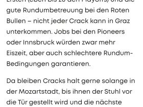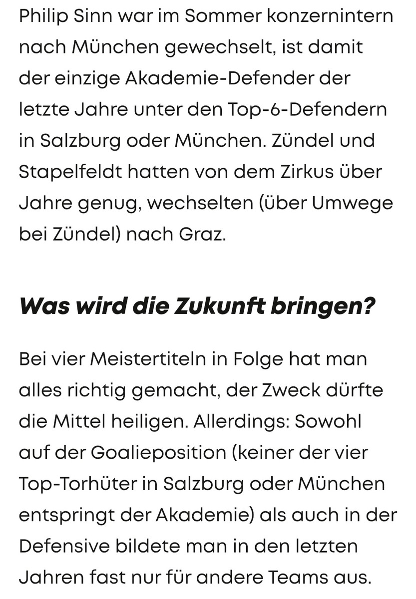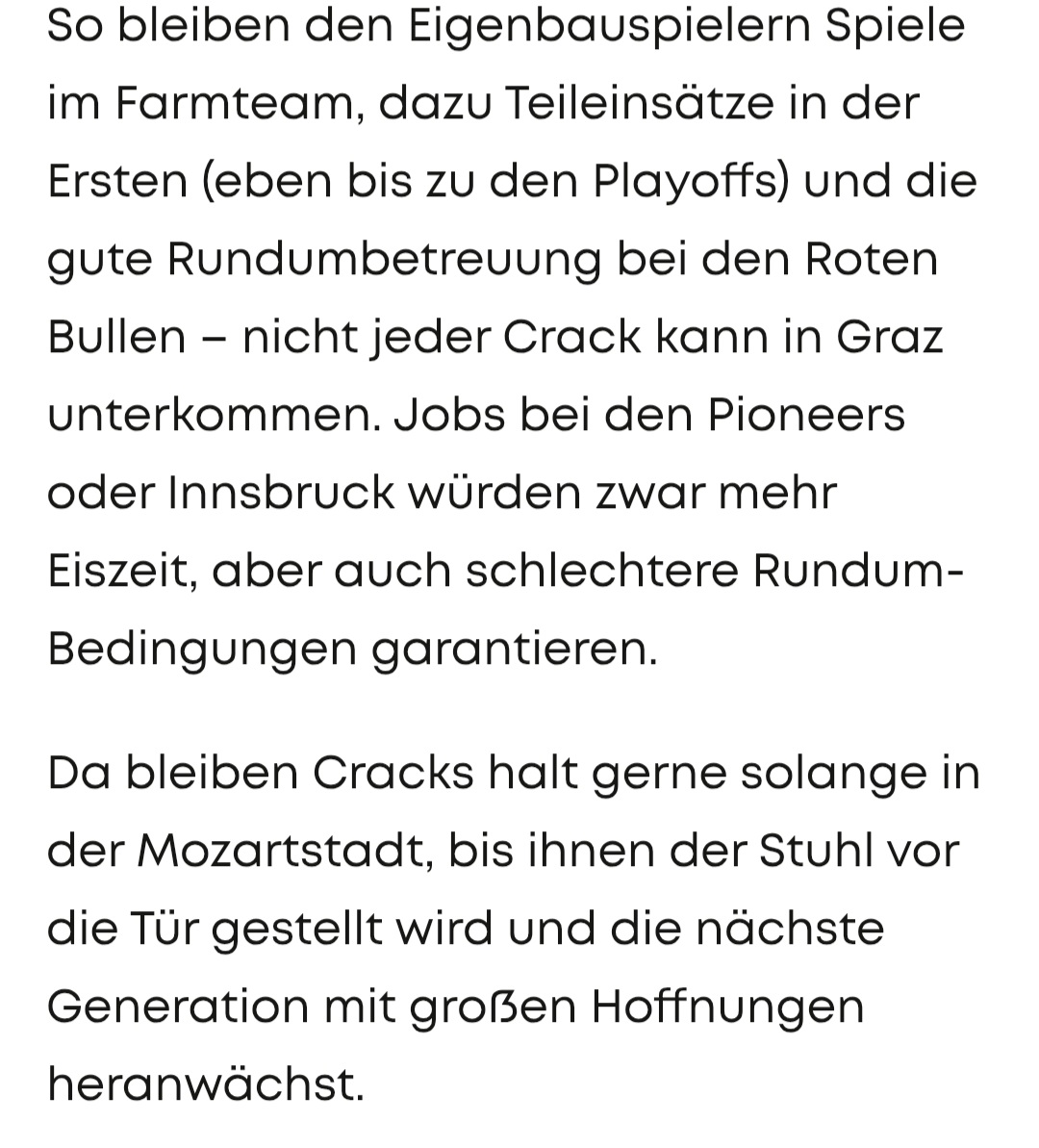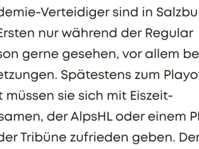 "Akademie-Verteidiger sind in Salzburg in der Ersten nur während der Regular Season gerne gesehen, vor allem bei Verletzungen. Spätestens zum Playoff-Start müssen sie sich mit Eiszeit-Brotsamen, der AlpsHL oder einem Platz auf der Tribüne zufrieden geben.