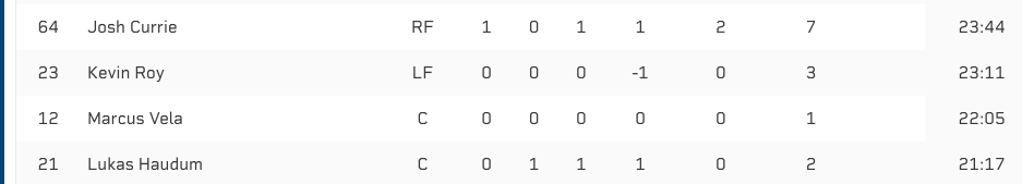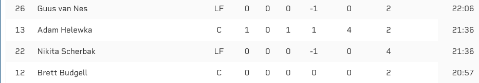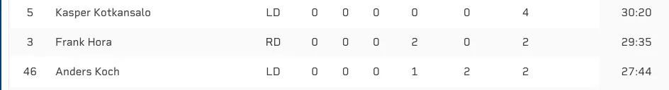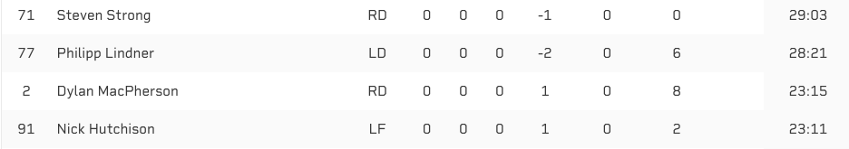 Beide hatten dazu noch Spieler mit kaum Eiszeit (4min für Uschan und Harnisch) und keiner Eiszeit (Braund und Prodinger 0).