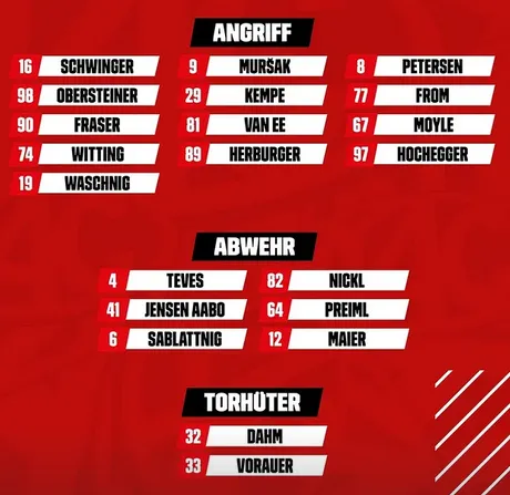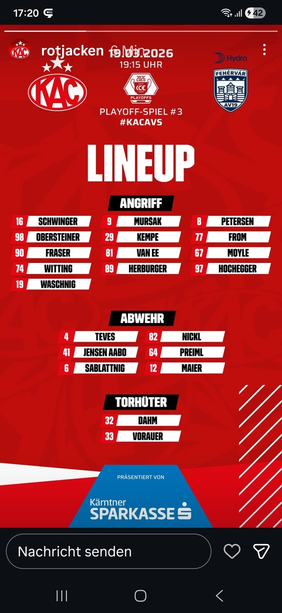 Interessant ist das dee Spieler der laut KAC am ehesten zurück kommt (Unterweger) fehlt und die 2 Stürmer spielen….was ja eh besser ist.