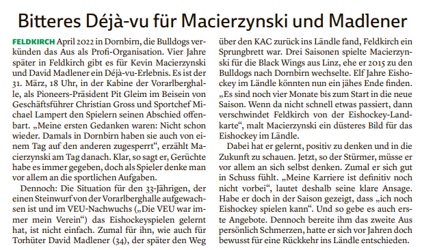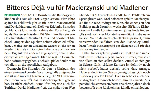 Ich gehe davon aus das es wiedwr für eine lange zeit gewesen ist mit erstligahockey in feldkirch.