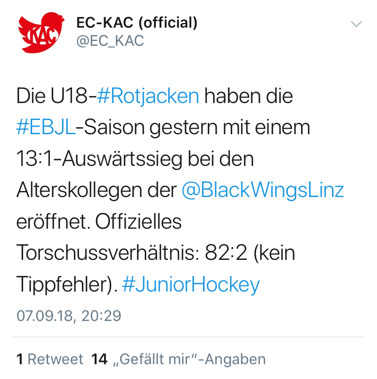 Jedenfalls hat der KAC Twitter-Account mit seinem Tweet (s.u.) in dem er explizit von einem Sieg bei Alterskollegen schreibt, für mich unverständlich wenig Gespür für Nachwuchshockey-Realität in Österreich bewiesen aber dafür anscheinend einen kleinen Sturm im Wasserglas ausgelöst.