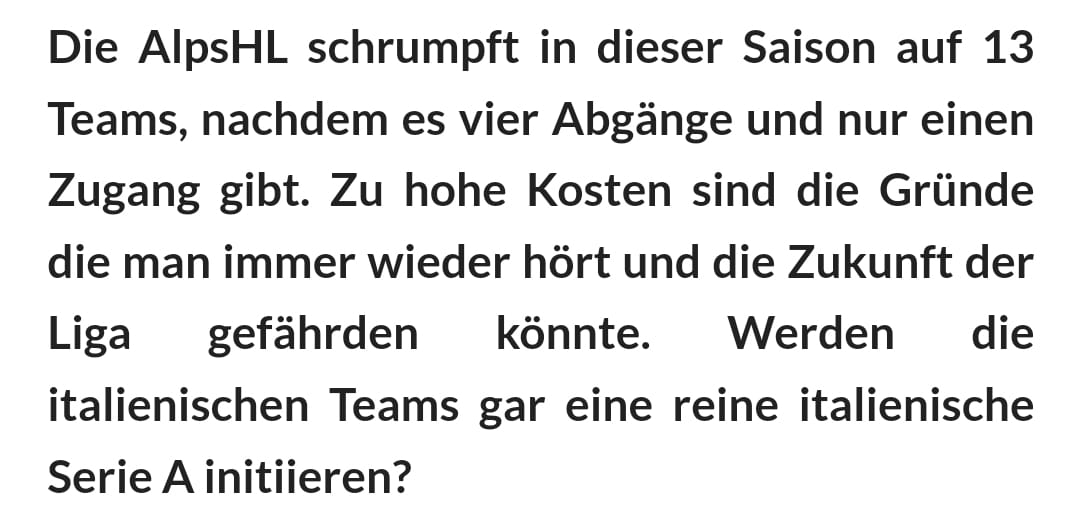 Der Zug ist mMn abgefahren. Verlorenes Interesse gewinnt man nicht zurück, indem man Mannschaften wie Sisak oder Celje in die Liga holt. Wer soll sich in Italien z. B. für solch eine Begegnung begeistern? Da kann man gleich gegen Eppan oder Kaltern spielen und man hat mehr Leute im Stadion. Das Potential der Liga war da, als Laibach, Asiago, Pustertal, Lustenau, Feldkirch etc. noch in der Liga waren, jetzt kann man die Liga und das Niveau kaum mehr mit früher vergleichen. Man hätte schon vor Jahren erheblich gegensteuern müssen, indem man diese strenge Punkteregel, die zu einer künstlichen Verjüngung der Kader und somit zu einem Rückgang des Niveaus führt, abschafft. Mittlerweile haben alle Zugpferde der Teilnehmerländer die Liga verlassen und mit dem, was geblieben ist, wirst kaum die Masse an Zuschauern vom Hocker reißen.