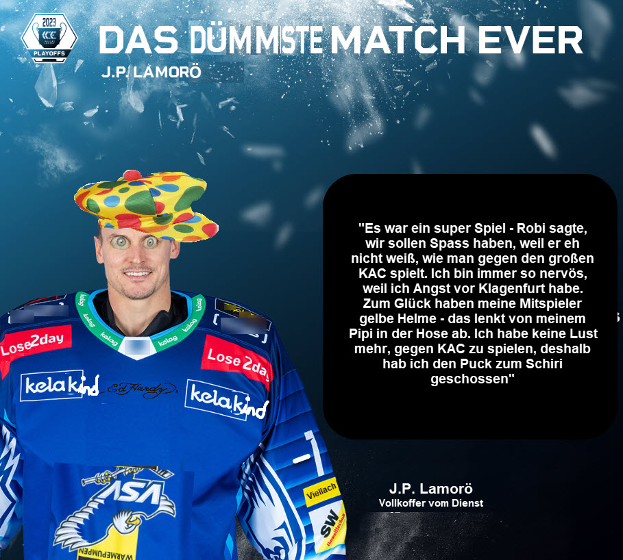 Was JP getan hat? Er versaut uns das VF. 8 Tore gegen den KAC in 3 Spielen, wovon 4 auf seine Kappe gehen. Es is eh schon wurscht - aber am Dienstag bitte Schmidt ins Tor. Und für nächstes Jahr: endlich einen 2er Goalie aufbauen, der ein Drittel der Spiele macht - gerne auch Schmidt…
