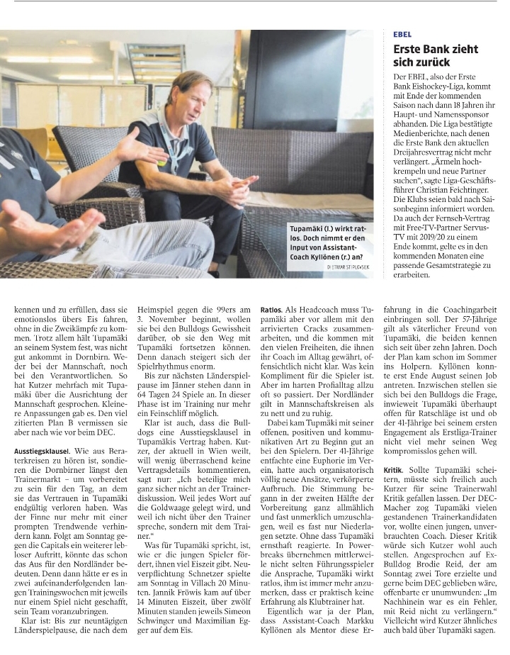 Das Spiel gegen den KAC läuft zwar noch, aber selbst im Falle eines Wunders würde das nix an meiner Meinung ändern. Ich bin jedenfalls schon auf die mediale Berichterstattung gespannt, insbesondere auf den Artikel in der NEUEN. Denn obwohl der Herr Mayer den Bulldogs sehr wohlgesonnen ist kann ich mir gut vorstellen, dass am Dienstag der Trainer (wohl zurecht) öffentlich in Frage gestellt wird.
