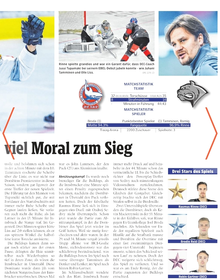 Aus DEC-Sicht schon recht ernüchternd... Unsere Defense wenig überraschend komplett überfordert und zwar nicht nur Egger und Kauppila. Die Zonenverteidung funktioniert überhaupt nicht, zum Teil auch haarsträubende Abspielfehler. Hier muss sich dringend was ändern, sonst wird das eine gaaanz schwere Saison.
