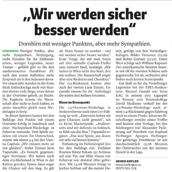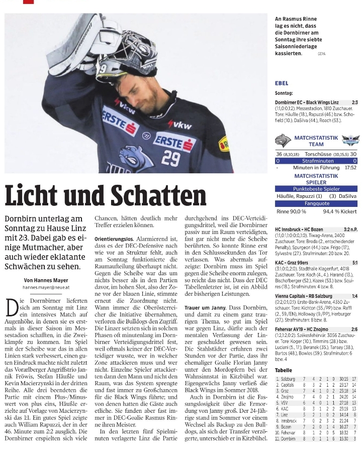 Aber de facto spielen wir im Moment mit nur 4 "gestandenen" Verteidigern (heut waren es sogar nur 3), von denen jener mit kanadischer Abstammung derzeit unterirdisch performt. Da ich aber nicht glaube, dass er das Eishockeyspielen über den Sommer verlernt hat, wird er wohl wie viele andere in der Mannschaft ein Problem damit haben, dass Konzept des Trainers umzusetzen.