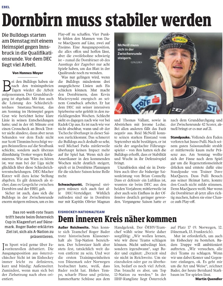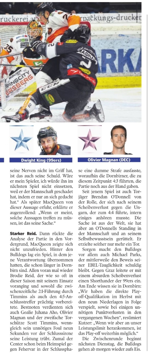 Beck-Debüt möglich. Dann wird auch Kevin Macierzynski wieder einsatzbereit sein, der den Bulldogs als hart arbeitender Stürmer an allen Ecken und Enden fehlt. Und auch Rasmus Rinne wird allerspätestens zu Beginn der Zwischenrunde wieder im DEC-Tor stehen. Selbst ein Blitz-Comeback am Wochenende ist möglich, wobei die Dornbirner kein Risiko bei Rinne eingehen wollen. Im Wissen, dass ihre Saison gelaufen ist, falls sich der Finne bei einem verfrühten Einsatz erneut verletzt und danach längerfristig ausfällt.