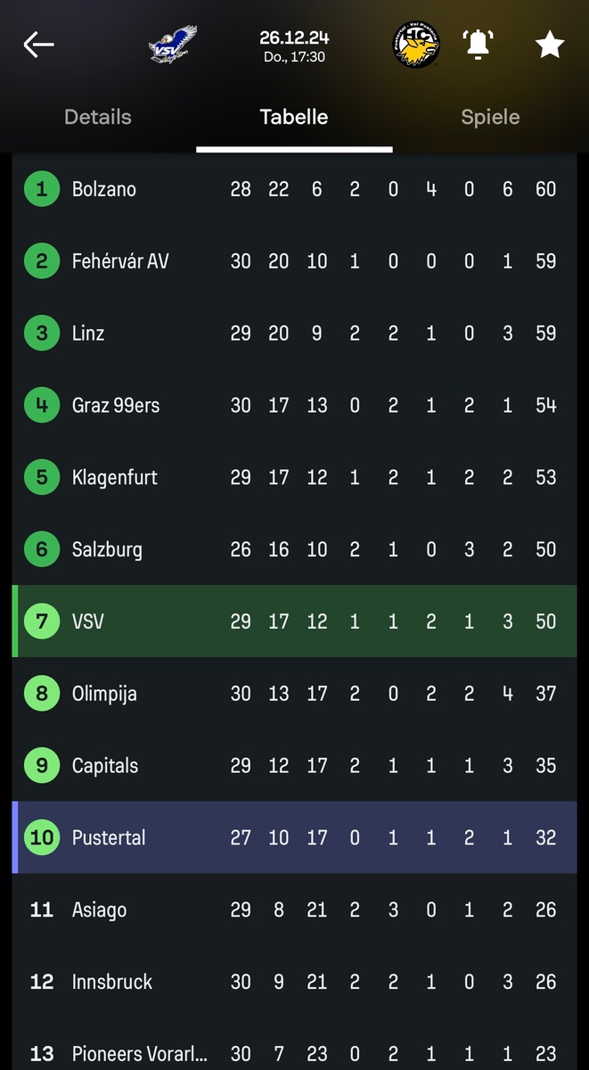 3 Punkte auf den KAC und Graz hat ein Spiel mehr und auch nur mehr 4 Punkte vor uns.