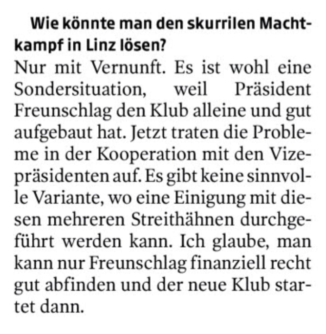 Also, mit der Schmutzkübelkampagne hat ja PF begonnen, man erinnere sich.. Weintrinkende Schönwettervizes die von nichts eine Ahnung haben z.B. dann sind noch die FanClubs (Obmänner) die man anpatzt.. Es hat vom Sprecher der Ex-Vizes kein einzig schlechtes oder böses Wort über PF gegeben, im Gegenteil.. man braucht sich nur die Videos (Podcasts von Sky) anhören.. Der grosse Zulauf zum neuen Verein kommt auch nicht von irgendwo.. wenn innerhalb kürzester Zeit, der Hauptsponsor, der Halleneigentümer, viele Groß- und Kleinsponoren überlaufen.. Einiges sagt auch aus dass sogar unserer Ex-Präsi, Willi Wetzl, den neuen Verein unterstützt und das ist nicht irgend wer sondern Willi Wetzl gemeinsam mit Pertl haben 2005 die Black Wings und damit auch das Linzer Eishockey aus der Scheisse gezogen... Das es dann emotional wird seitens der Fans ob dort oder da ist doch verständlich.. Und GB hat auch nicht dazu beigetragen, im Gegenteil, zB die Aussagen als Sky-Experte über Linz ?!?! Das er jetzt hinstellt, er musste ja objektiv bleiben - das nennt man so wenn man über einen Verein kein gutes Haar lässt, interessant.. Also verarschen kann er wem anderen.. Da darf er sich nicht aufregen wenn Fans des neuen Vereines jetzt auch objektiv über ihn reden... Das da die OÖN ein Rädchen dabei ist, Öl ins Feuer zu gießen find ich auch nicht ok aber so sind alt die Medien wenn sie zu wem mehr Bezug haben...