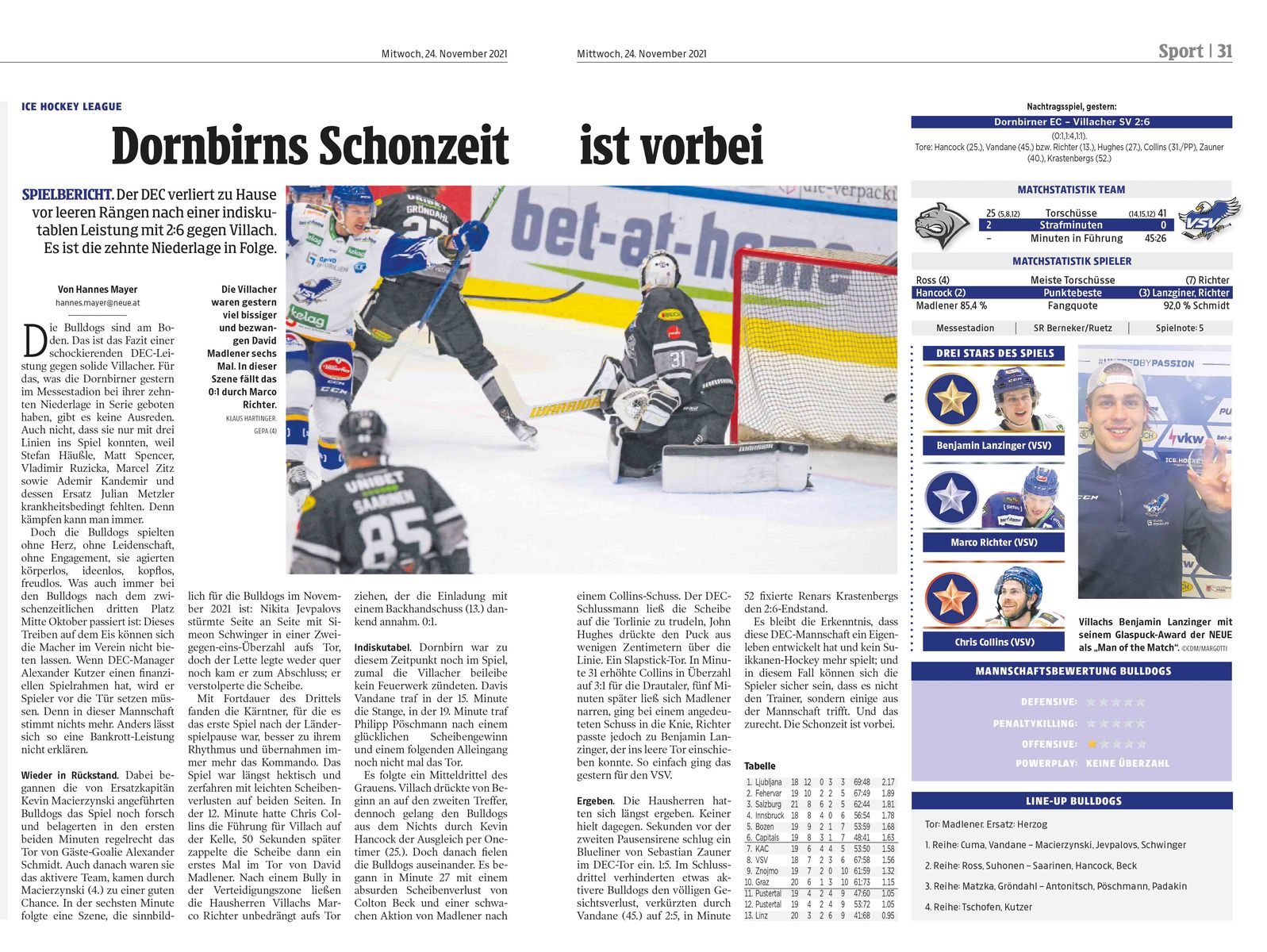 Die Behauptung, dass ich nach Ligaspielen in der Bulldogs-Kabine war ist schlichtweg gelogen. Ich war genau ein einziges Mal nach eimem DEC-Spiel in der Kabine, nach einem Freundschaftsspiel, dabei habe ich bemerkt, dass ein Spieler überhaupt nicht Englisch sprechen konnte und völlig isoliert war. Das habe ich dann wochenlang medial thematisiert, was mir ziemlichen Ärger einbrachte. Und sowieso: Die Mixed-Zone und der Kabinentrakt waren im Messestadion mit einer Gittertür abgetrennt, samt personeller Bewachung des Tors. Ich lese hier ständig die Behauptung, dass ich DEC-Fan sei. So ein Quatsch! Ich habe regelmäßig in Dornbirn angeeckt, weil ich ein kritischer Mensch bin und auch nichts von einer patriotischen Berichterstattung halte. Das bekommt morgen auch ein anderer Vorarlberger Sportverein zu spüren.
