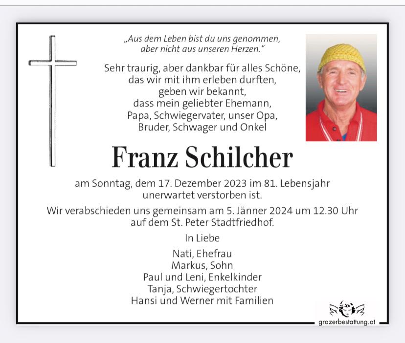 Herzlichen Dank für den Nachruf zum schmerzlichen Verlust meines Bruders. Franzi war nicht nur im Eishockey vertreten, sondern spielte in den 60er Jahren Fußball bei ESK Graz und Lapp Finze Kalsdorf sowie Faustball beim ATSE Graz und Tennis bei verschiedenen Vereinen. Immer war sein Streben zu gewinnen. Wir vermissen ihn jetzt schon. Hansi Schilcher