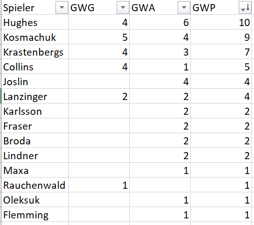 Interessant wäre noch, gegen wen die Gamewinner erzielt oder vorbereitet wurden.