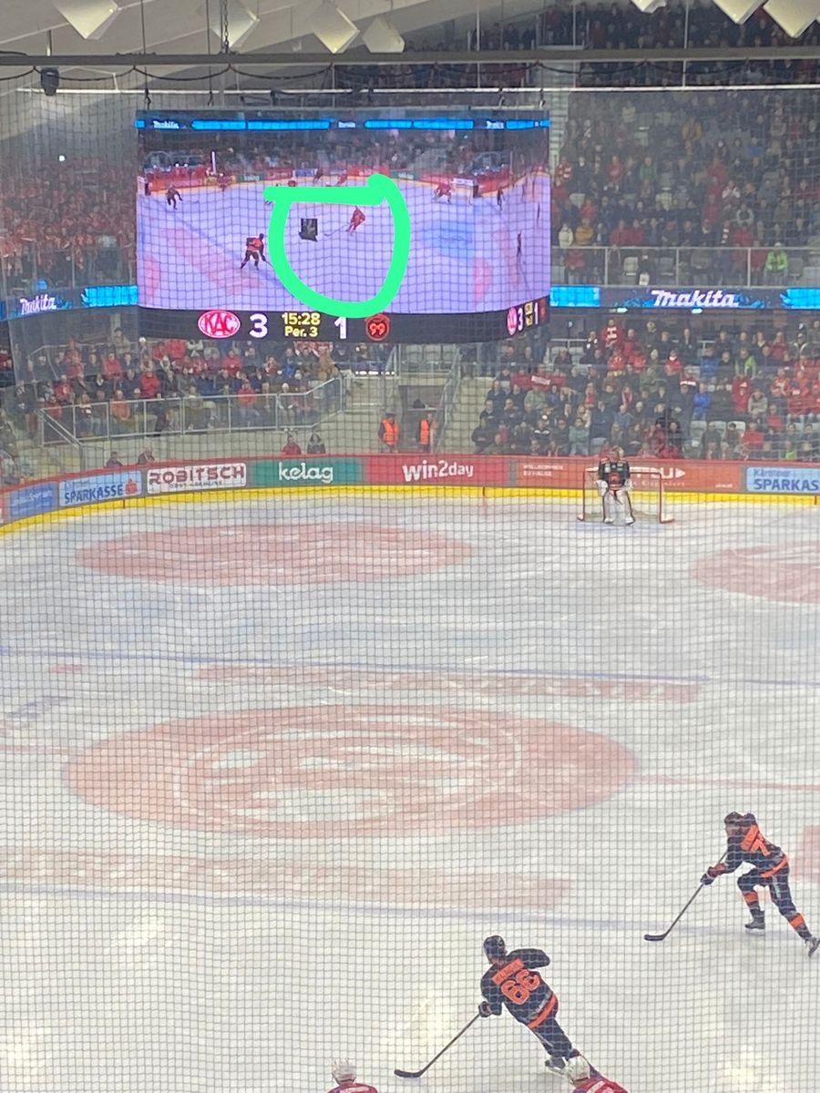Euronen Schonkost macht sich auch an der sensationellen Architektonik eines Maschendrahtzauns anstatt einer Glas-Sturzabsicherung. Dadurch komm ich mir in der 1. Reihe des Oberrangs vor als würde ich meinem Nachbar beim Rasenmähen zuschauen, wenn die Eismaschine gerade die Eisfläche reinigt, aber alles gut.