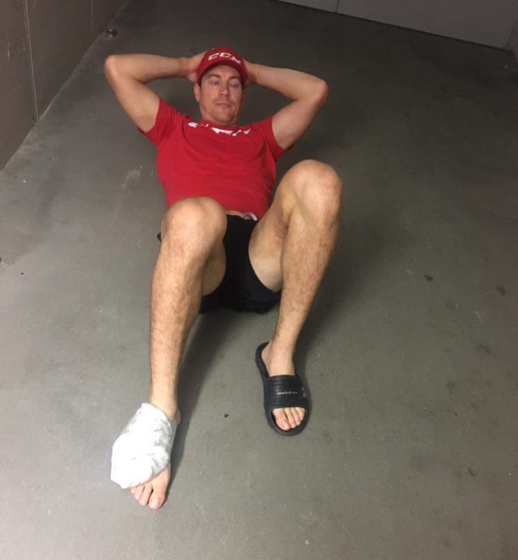 Bild wurde soeben auf FB vom Kärntner Eishockeymagazin gepostet mit dem Untertitel: Da schmerzt der Fuß bei Nick Petersen nicht mehr so!
