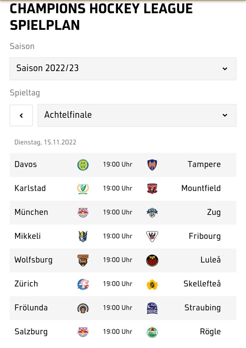 Champions Hockey League Spielplan & Ergebnisse Saison 2022/23 | SPORT1Aktueller Spielplan zur Champions Hockey League Saison 2022/23 - Alle Spiele & Ergebnisse im Überblick. Hier zum Champions Hockey League-Spielplan Saison…www.sport1.de -
