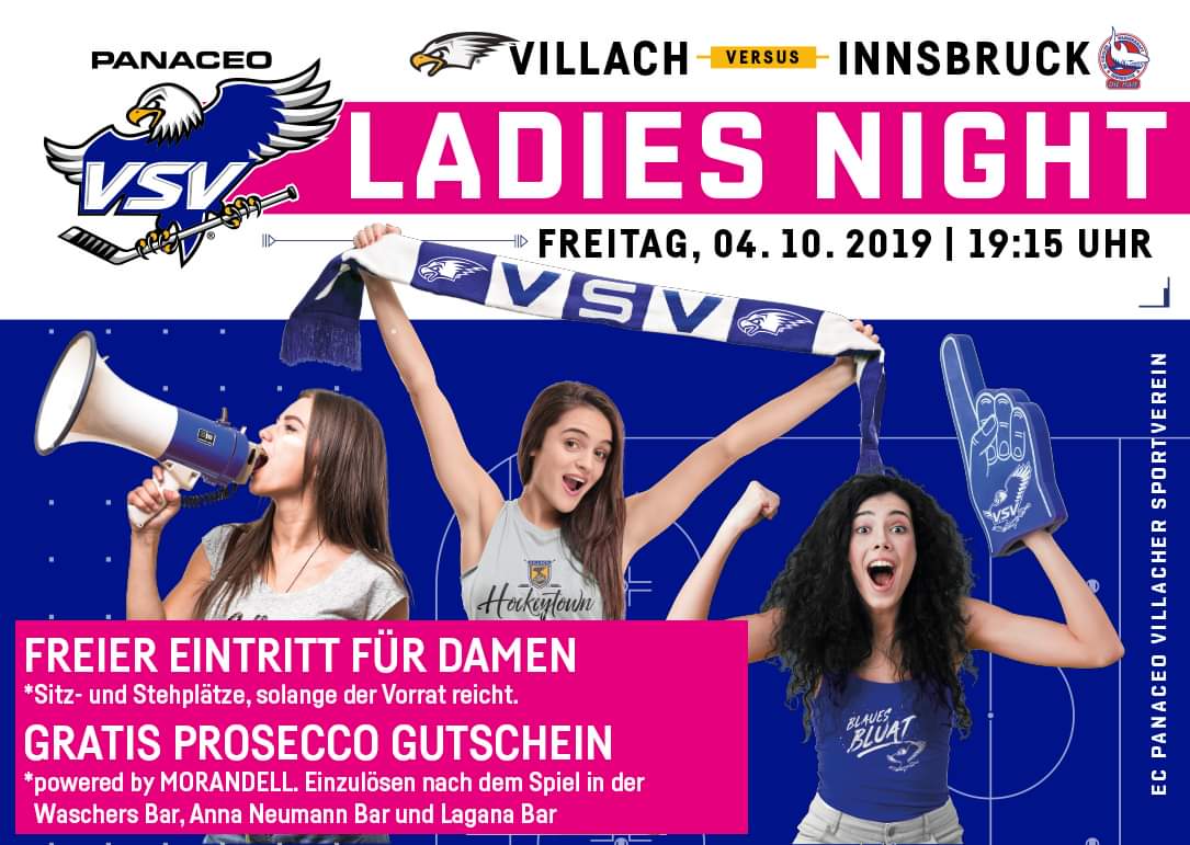 Freitag gegen die Haie gibts eine Ladies-Night. Alle Frauen erhalten freien Eintritt solange der Vorrat reicht und dazu einen Gutschein für ein Glas Prosecco in einer von 3 teilnehmenden Bars.