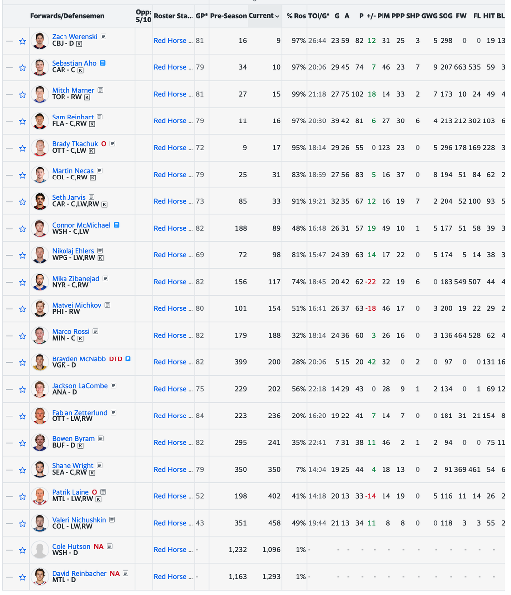 1 Werenski 9 2 Aho 10 3 Marner 15 4 Reinhart 16 5 Tkachuk 17 6 Necas 31 7 Jarvis 33 8 McMichael 89 9 Ehlers 98 10 Zibanejad 117 11 Ullmark 131 12 Michkov 154 13 Rossi 188 14 McNabb 200 15 LaCombe 202 16 Andersen 206 17 Zetterlund 236 18 Byram 241 19 Kochetkov 243 20 Wright 350 21 Laine 402 22 Nichuskin 458 23 Hutson 1096 24 Reinbacher 1293 -