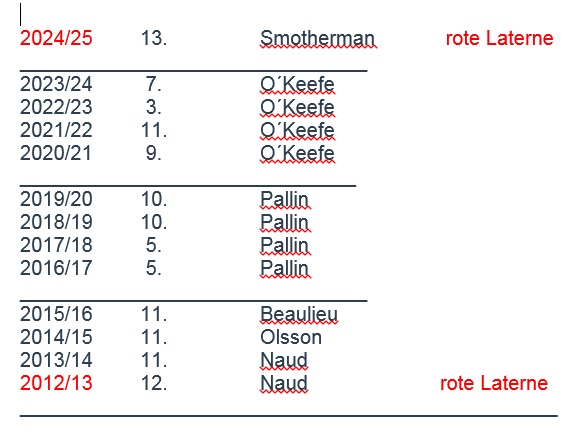 der vergleich der saisonen seit wiedereinstieg führt allerdings zur erkenntnis, man ist wieder dort wo man gestartet ist, nämlich im keller, diesmal im 13ten....![]()